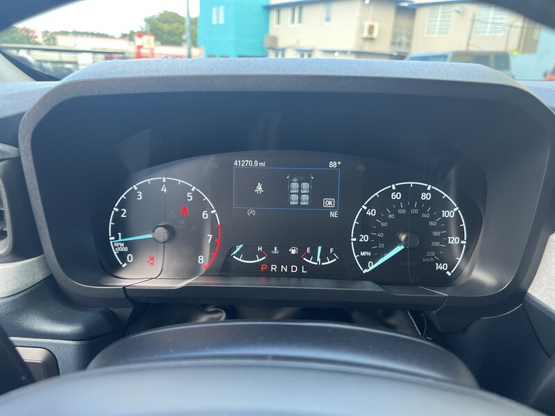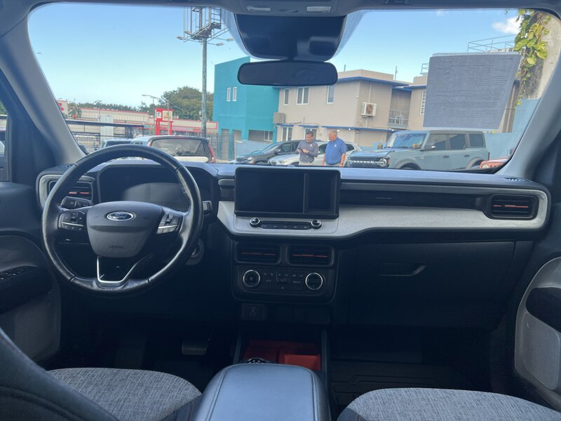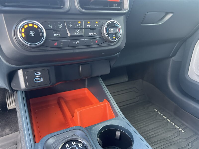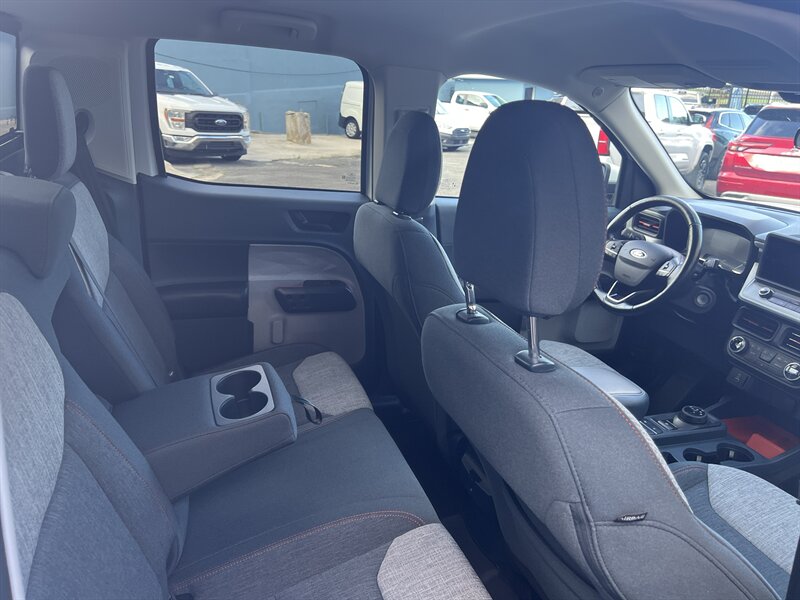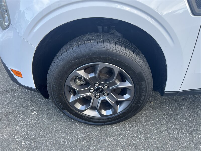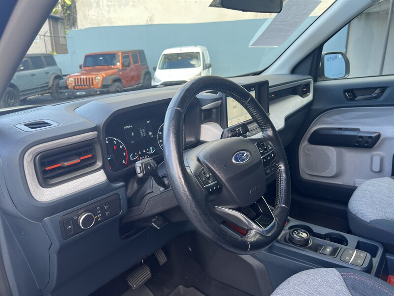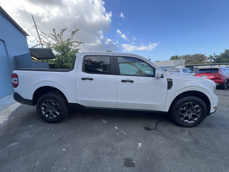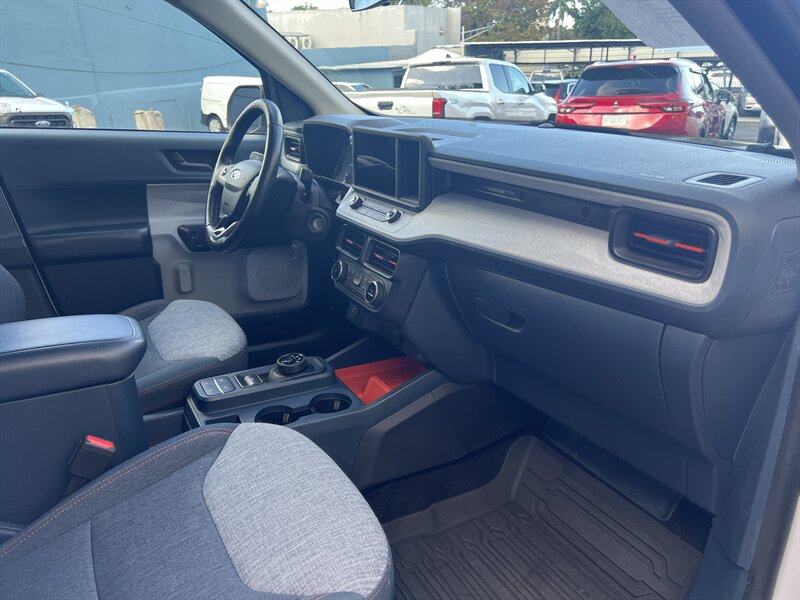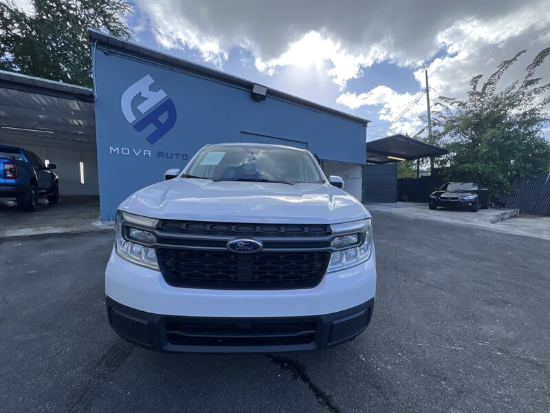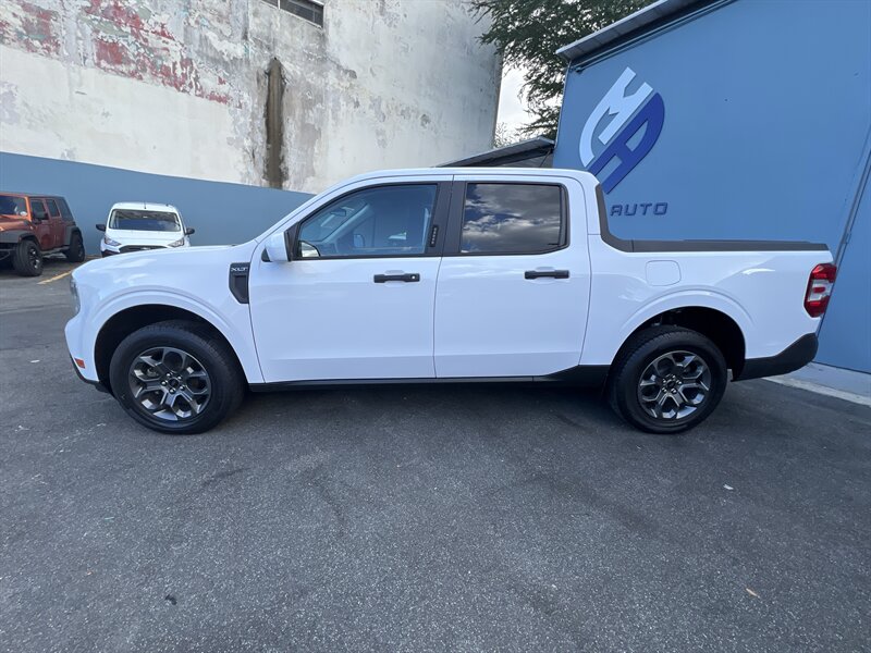 Ford Maverick XLT 2022 en Oxford White con interior Navy Pier/Medium Slate. Con motor EcoBoost 2.0L Turbo I4 (250 hp, 277 lb-ft) y transmisión automática de 8 velocidades, este pickup compacto ofrece gran economía de combustible (23 MPG ciudad / 30 MPG carretera) y menos de 42,000 millas (aprox. 9,000 millas/año). Las características de fábrica incluyen pantalla táctil de 8" con SYNC (Apple CarPlay y Android Auto), Bluetooth y puertos USB, tapicería de tela, ventanillas/segundos eléctricos, entrada remota sin llave, cámara de reversa, paquete de seguridad Ford Co-Pilot360 (asistente de pre-colisión con frenado automático, ayuda de permanencia en el carril, faros automáticos), asientos traseros 60/40 que se abaten en plano para el sistema de carga FlexBed, y rines de aleación. El vehículo está en excelente estado general.