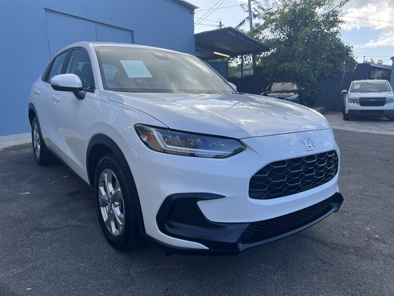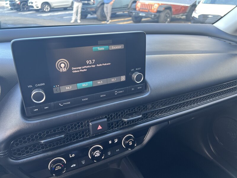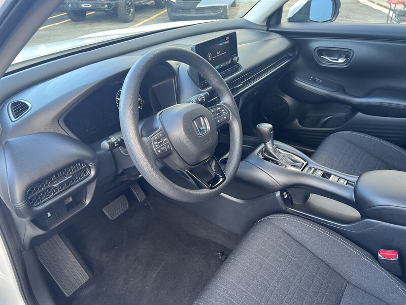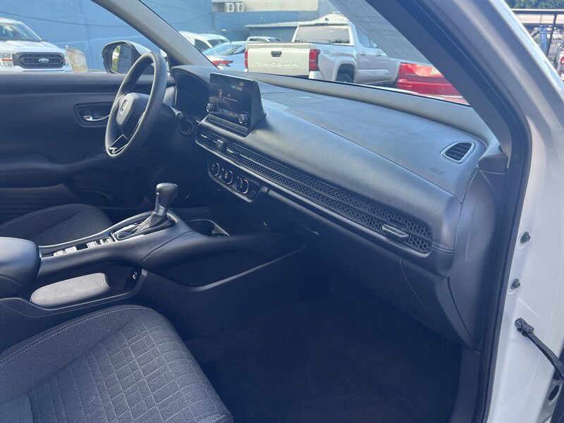 2023 Honda HR-V LX — exterior Platinum White Pearl y interior en tela gris, impulsado por un motor 2.0L I4 (158 hp, 138 lb-ft) con transmisión CVT suave. Las características de fábrica incluyen el paquete de seguridad Honda Sensing (Frenado Mitigador de Colisiones, Mitigación de Salida de Carril, Control de Crucero Adaptativo, Asistencia de Mantenimiento de Carril), cámara trasera de múltiples ángulos, entrada remota sin llave, elevalunas y seguros eléctricos, aire acondicionado, control de crucero, audio y manos libres por Bluetooth, puerto USB y los asientos traseros “Magic Seat” 60/40 con múltiples configuraciones para carga. Bajo kilometraje — menos de 23,000 millas (promedio <6,000/ año), en excelente estado y muy eficiente: 26 MPG ciudad / 32 MPG carretera — práctico, seguro y listo para alegrar tus viajes.