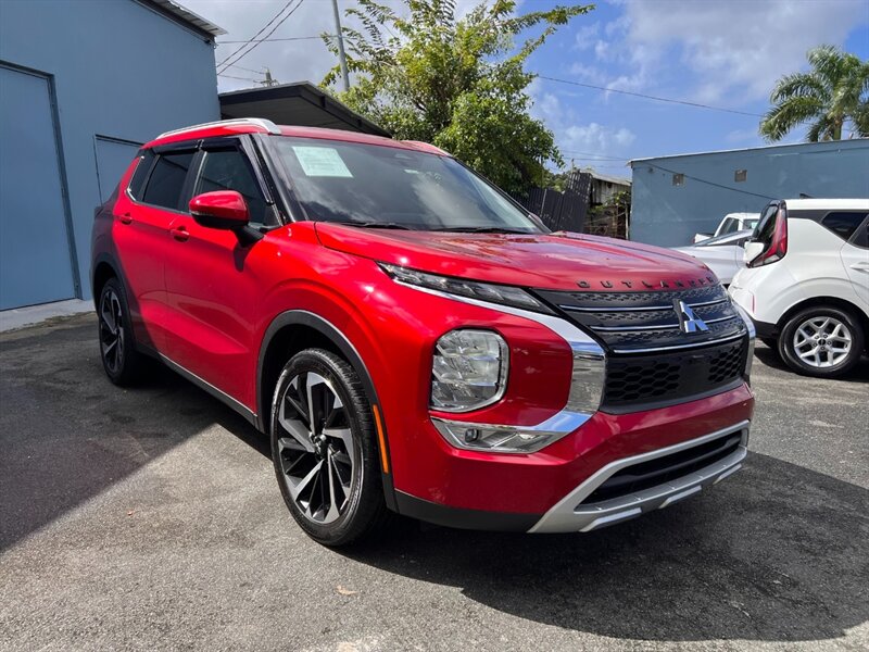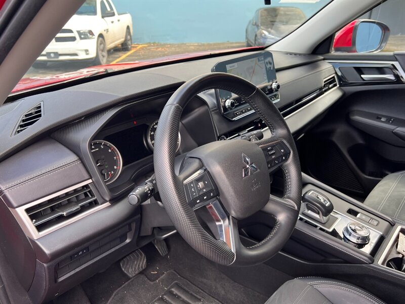 2023 Mitsubishi Outlander Black Edition — Red Diamond exterior, Black interior. Powered by a 2.5L I4 producing 181 hp and 181 lb-ft of torque, this Outlander averages 24 MPG city / 31 MPG highway and has excellent mileage with under 17,000 miles (less than 5,000 miles/year). Factory features include black 20” alloy wheels and Black Edition exterior accents, LED headlights and fog lights, power liftgate and roof rails; a comfortable 7-passenger interior with black leather seating, heated front seats and heated steering wheel, power driver’s seat and fold-flat third row; an infotainment system with touchscreen, Apple CarPlay/Android Auto, Bluetooth and USB ports; tri-zone climate control; and a full suite of Mitsubishi safety tech including Forward Collision Mitigation, Adaptive Cruise Control, Lane Departure Warning, Blind Spot Warning and Rear Cross Traffic Alert. This vehicle is in excellent overall condition.