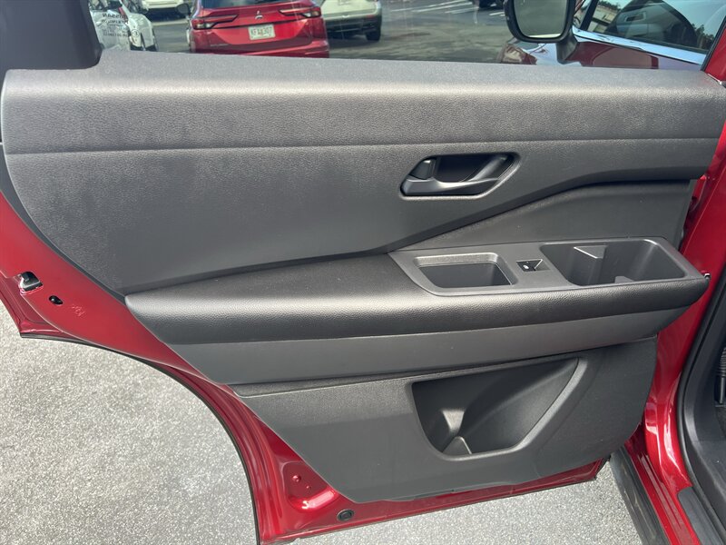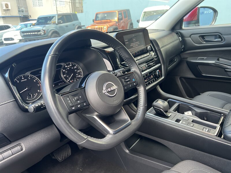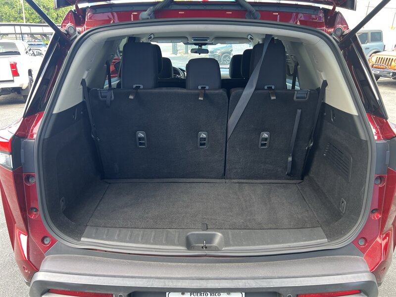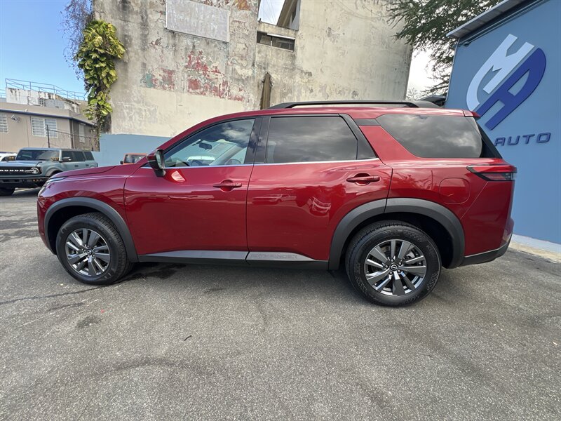 Nissan Pathfinder SV 2023 con motor 3.5L V6 (284 hp, 259 lb-ft) en Scarlet Ember Tintcoat con interior Charcoal. Menos de 22,000 millas (promediando menos de 6,000 millas/año) y con consumo aproximado de 20 MPG en ciudad / 27 MPG en carretera; el vehículo está en excelente condición general. Las características de fábrica incluyen capacidad para hasta ocho pasajeros con tercera fila, pantalla táctil de 8 pulgadas con Apple CarPlay y Android Auto, Bluetooth, control climático automático de tres zonas, entrada sin llave con encendido por botón y arranque remoto disponible, portón trasero eléctrico, rieles de techo, llantas de aleación, faros automáticos, cámara trasera y el paquete de asistencia Nissan Safety Shield 360 (frenado automático de emergencia, advertencia de punto ciego, alerta de tráfico cruzado trasero, advertencia de salida de carril y asistencia de luces altas). Tracción delantera estándar; la tracción en las cuatro ruedas estaba disponible de fábrica.