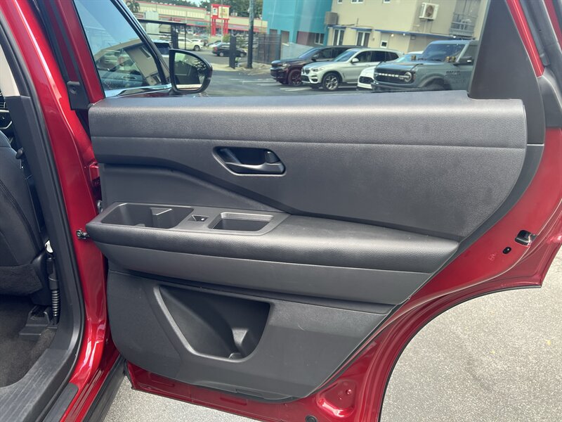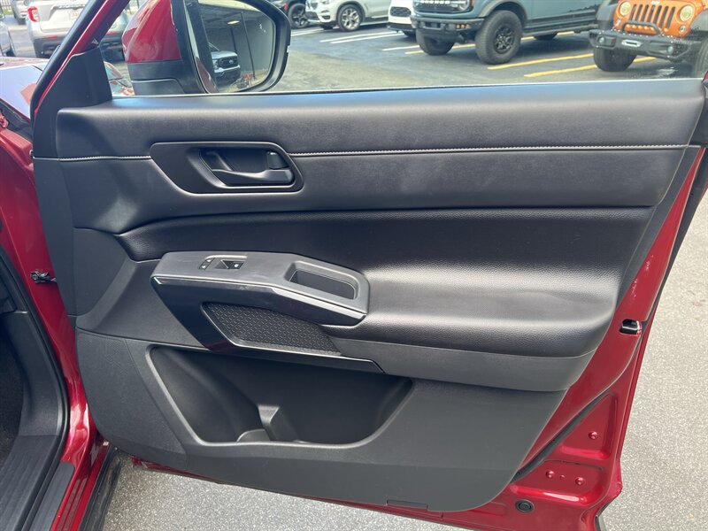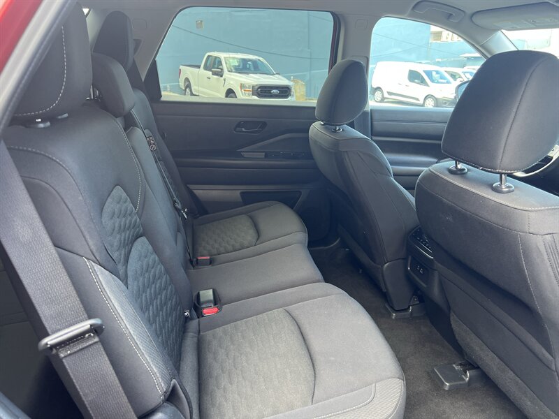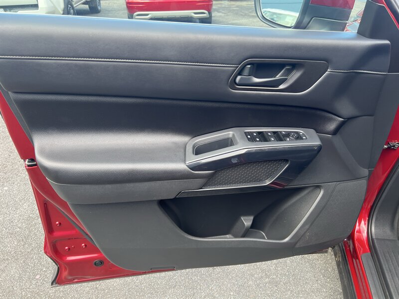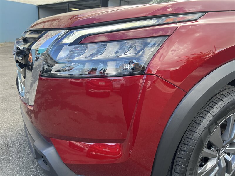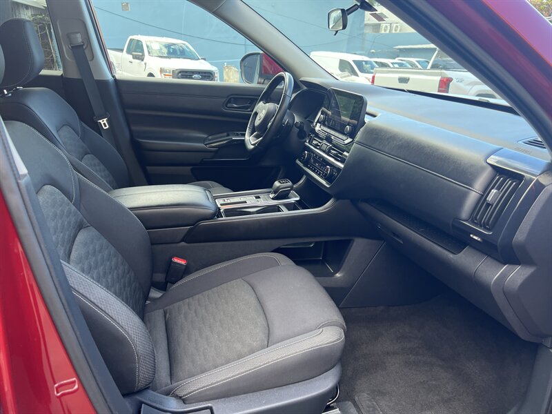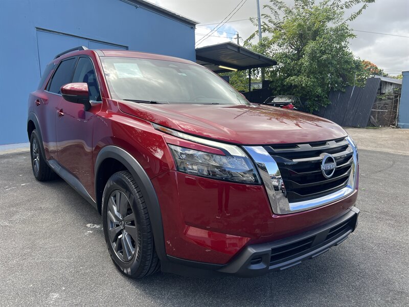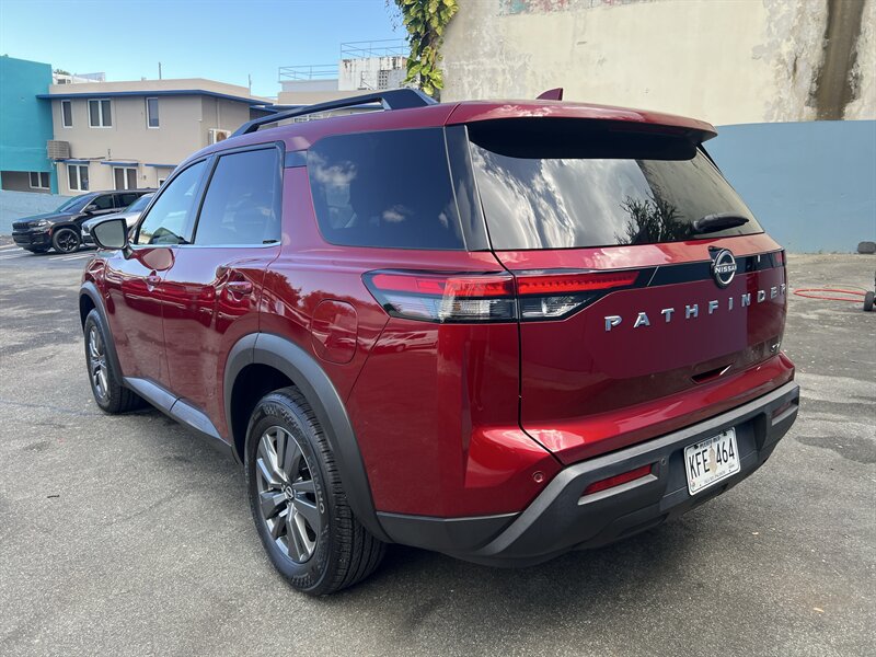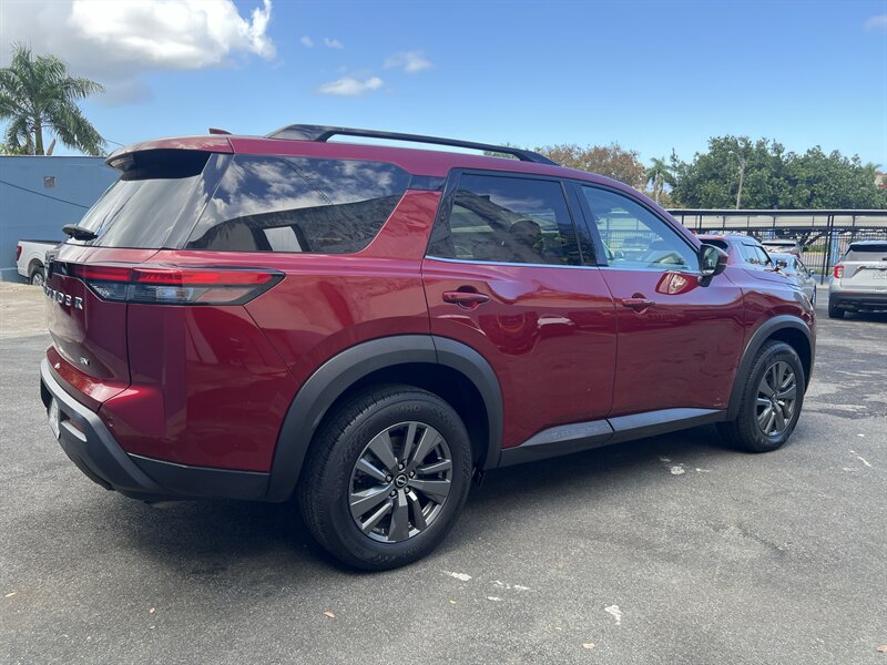 2023 Nissan Pathfinder SV with the 3.5L V6 (284 hp, 259 lb-ft) in Scarlet Ember Tintcoat with Charcoal interior. Under 22,000 miles (averaging less than 6,000 miles/year) and rated about 20 MPG city / 27 MPG highway; vehicle is in excellent overall condition. Factory-standard features include seating for up to eight with a third row, an 8-inch touchscreen infotainment system with Apple CarPlay and Android Auto, Bluetooth, tri-zone automatic climate control, keyless entry with push-button start and available remote start, power liftgate, roof rails, aluminum-alloy wheels, automatic headlights, rearview camera, and Nissan Safety Shield 360 driver-assist technologies (including automatic emergency braking, blind-spot warning, rear cross-traffic alert, lane departure warning, and high beam assist). Front-wheel drive is standard; all-wheel drive was available from the factory.