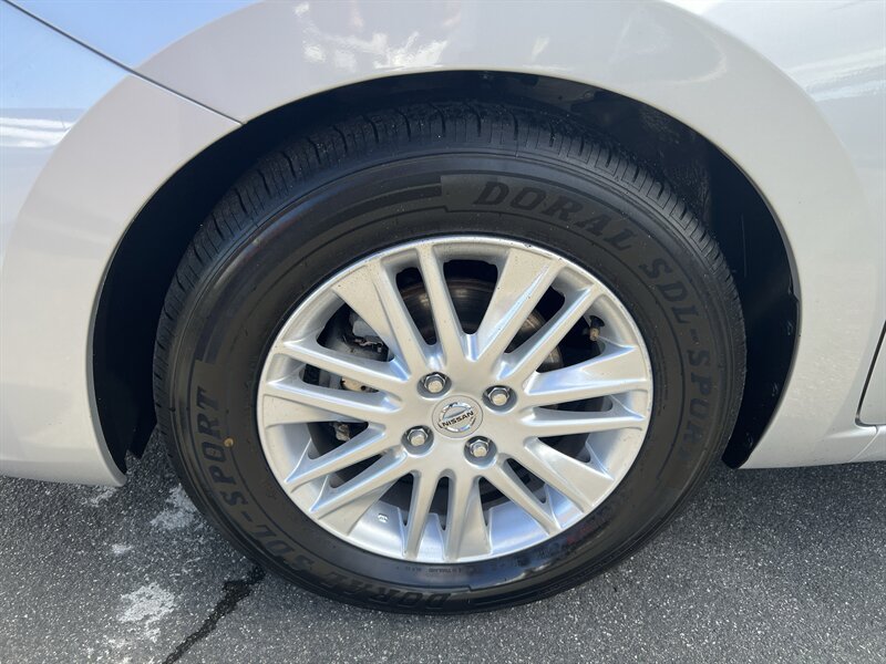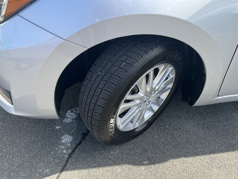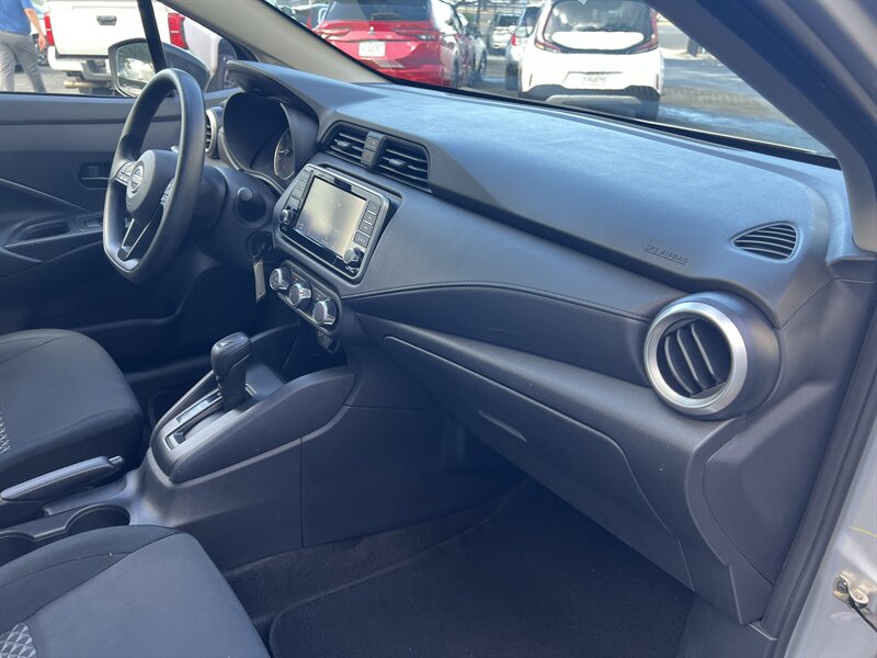 Alerta de encanto práctico — Nissan Versa S 2024 con motor 1.6L I4 (122 hp, 114 lb-ft) y CVT Xtronic, rindiendo 32 MPG ciudad / 40 MPG carretera. De fábrica trae el paquete Safety Shield 360 de Nissan (Frenado automático con detección de peatones, Frenado automático trasero, Alerta de punto ciego, Alerta de tráfico cruzado trasero, Alerta de cambio de carril, Asistente de luces altas), cámara trasera, pantalla táctil de 7" con Apple CarPlay y Android Auto, Bluetooth y puertos USB, aire acondicionado manual, volante abatible, entrada remota sin llave, asientos de tela en Charcoal con respaldo 60/40 abatible, rines de acero con tapones, monitoreo de presión de llantas y control de tracción y estabilidad. Exterior Brilliant Silver Metallic, interior Charcoal, en excelente estado general — económica, vivaz y con mucho estilo.